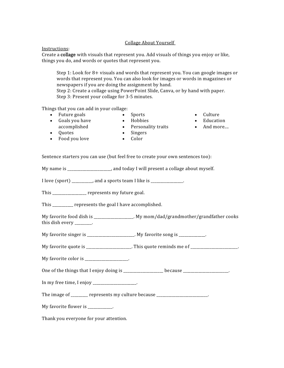 My name is _______________________, and today I will present a collage about myself.I love (sport) ___________, and a sports team I like is _________________.This __________________ represents my future goal.This ___________ represents the goal I have accomplished.My favorite food dish is _____________________. My mom/dad/grandmother/grandfather cooks this dish every _________.My favorite singer is _________________________. My favorite song is ______________.My favorite quote is ________________________. This quote reminds me of _____________________________ .My favorite color is _______________________.One of the things that I enjoy doing is _____________________ because ________________________.In my free time, I enjoy _______________________.The image of _________ represents my culture because ___________________________.My favorite flower is _____________.Thank you everyone for your attention.