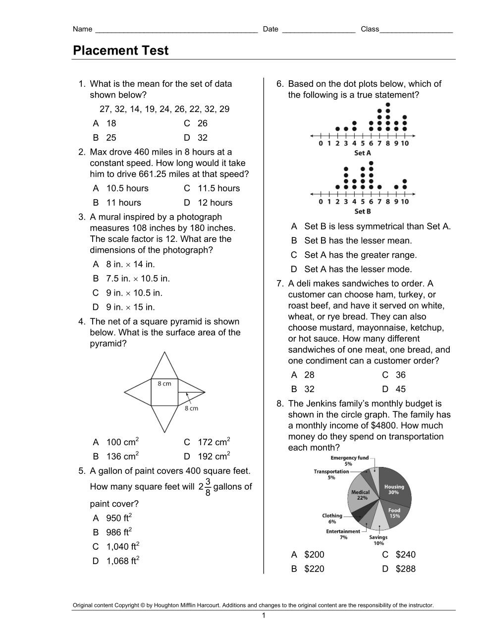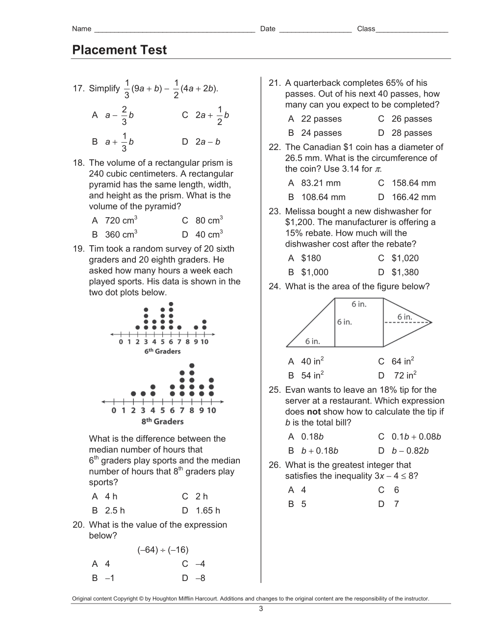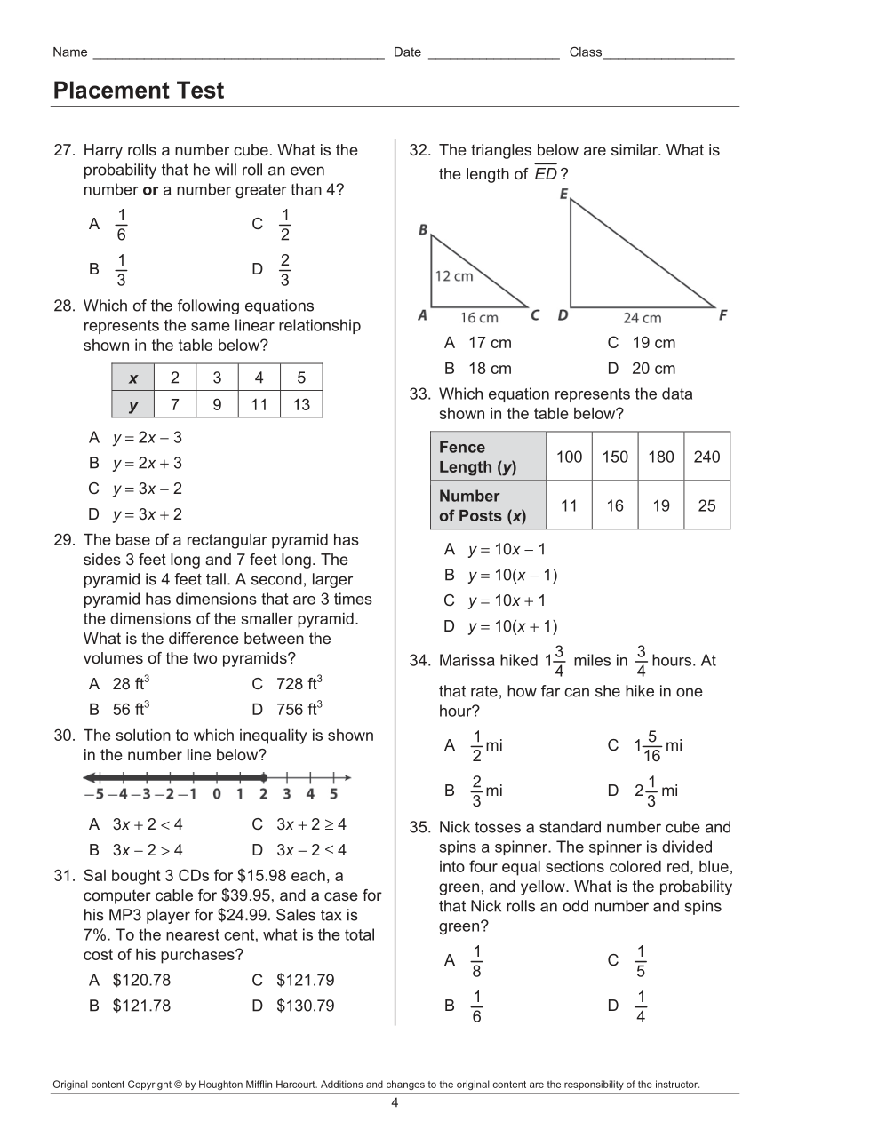GoMath Placement test with standards attached based on the HRW "Individual Student Profile" for this task.