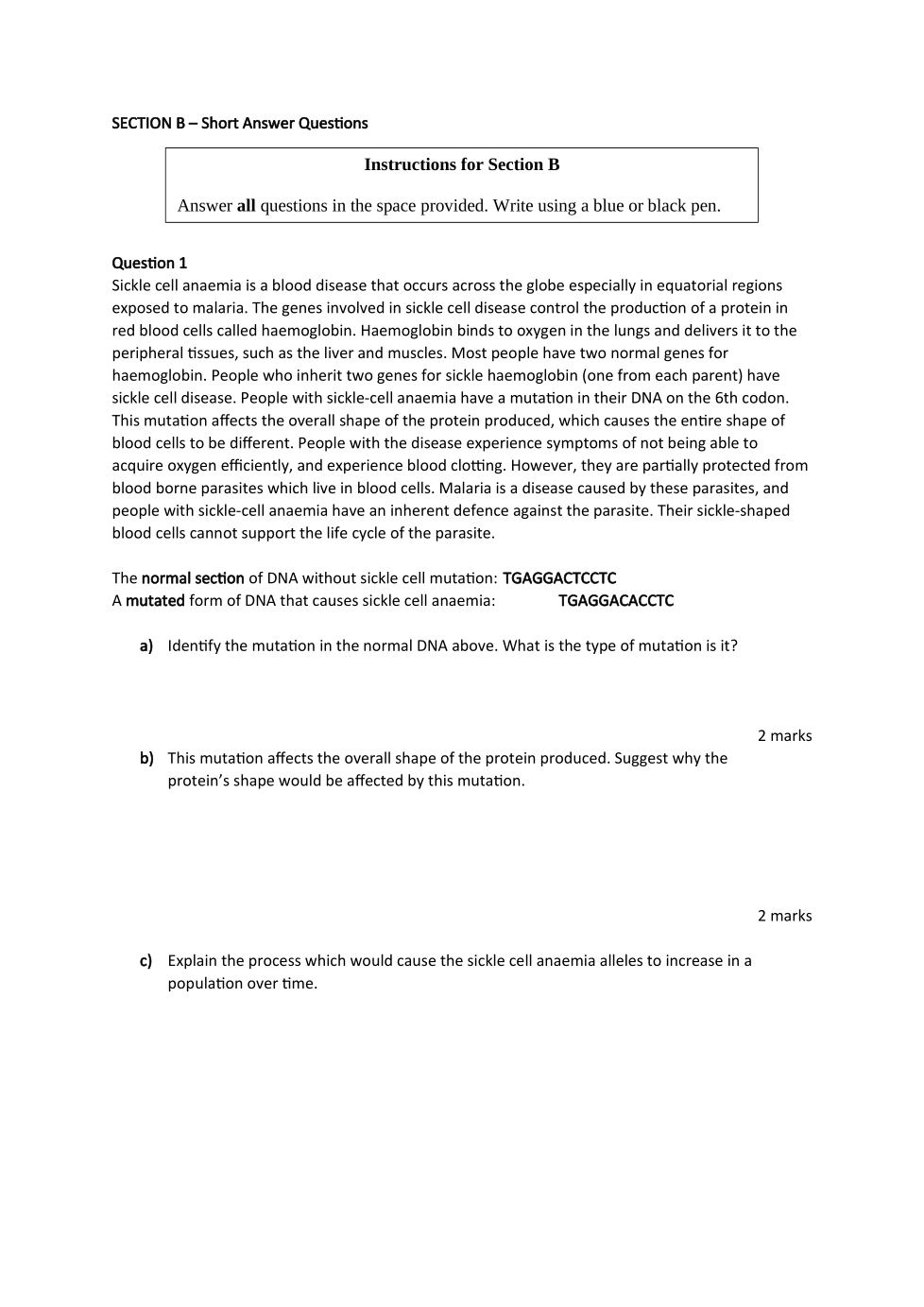 Question 1. c) Explain the process which would cause the sickle cell anaemia alleles to increase in a population over time.