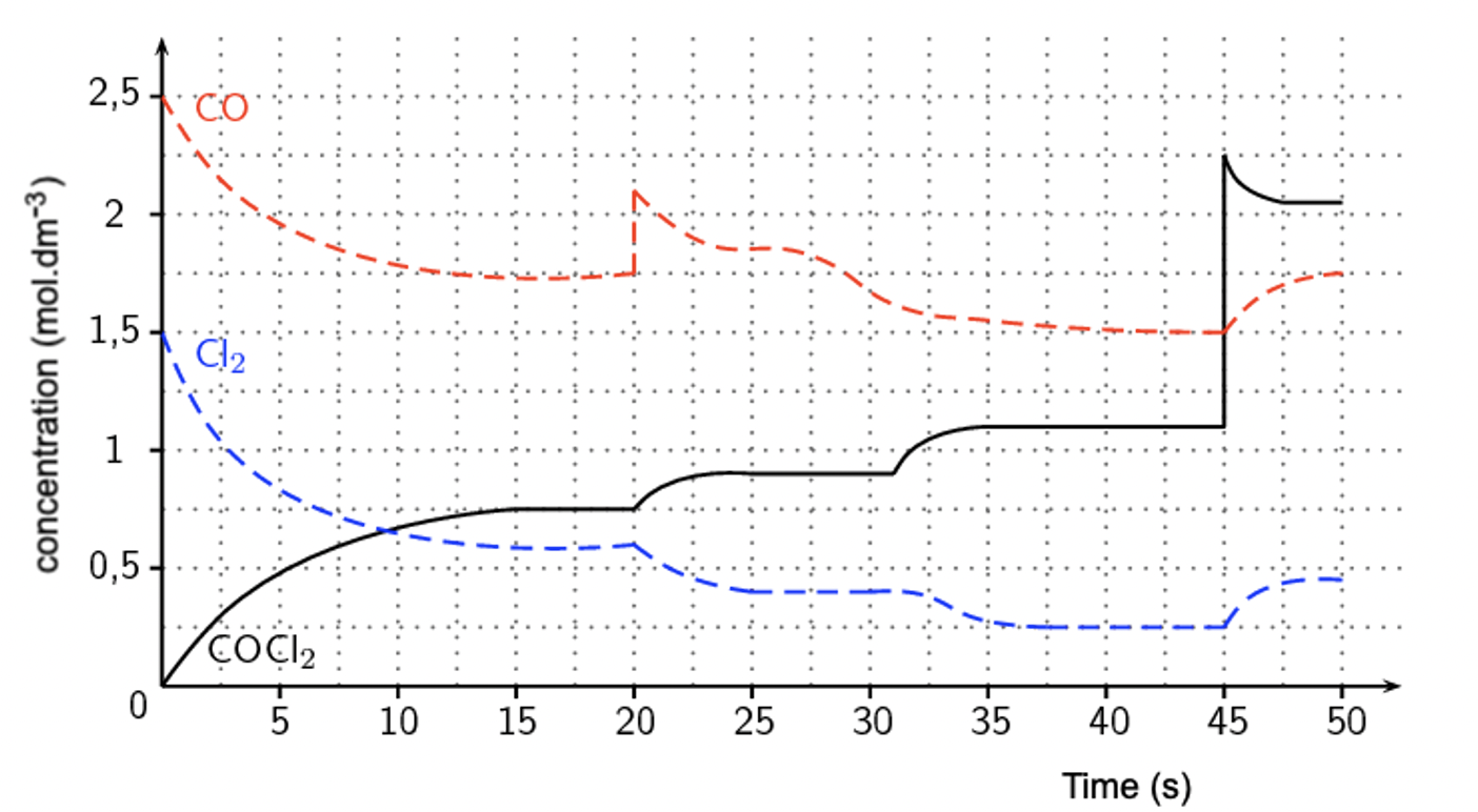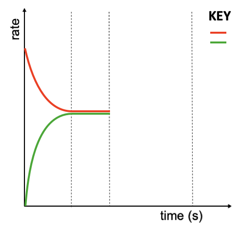 Redraw and complete the following rate graph illustrating the effect of reducing the volume of the container on reaction rate as the system adjusts to reach a new equilibrium. Be sure to complete the key. (if you don't have coloured pens then use solid line and dotted line)