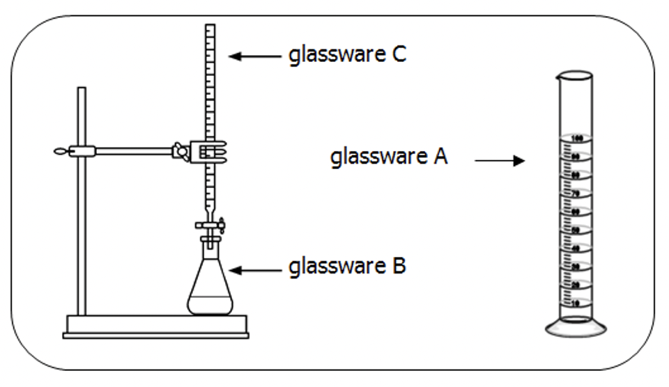 In this laboratory procedure, 25 cm3 of the hydrochloric acid is placed into glassware B with a few drops of indicator.