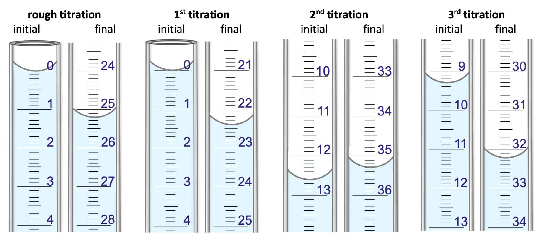 The barium hydroxide is placed into glassware C. After performing an initial “rough” titration, three titration attempts are performed. The following diagrams show sections of glassware C with the initial and final readings for each attempt: