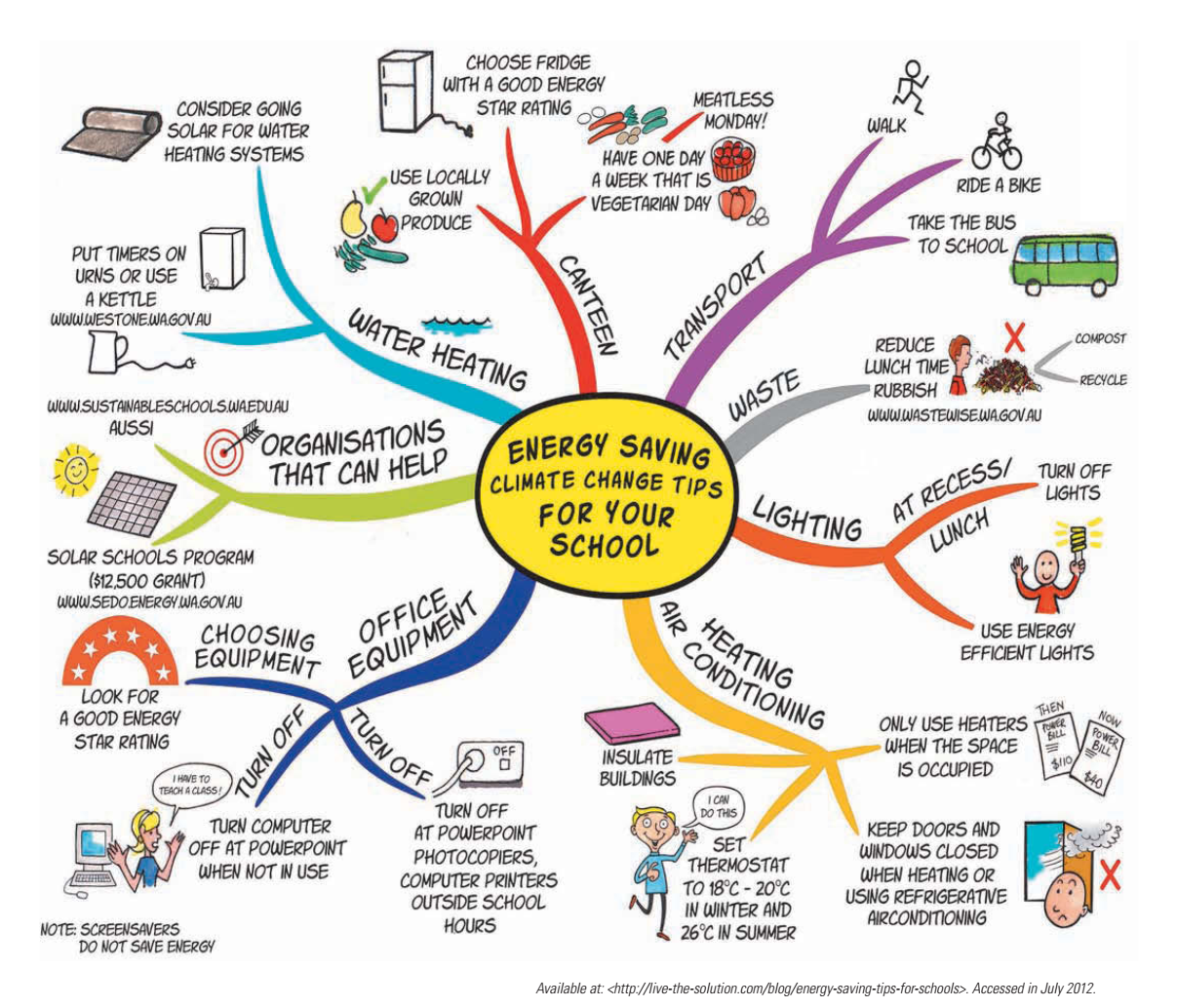 Recycle.Ride a bike.Take the bus to school.Reduce lunch time rubbish.Keep doors and windows closed when heating or using refrigerative air conditioning.