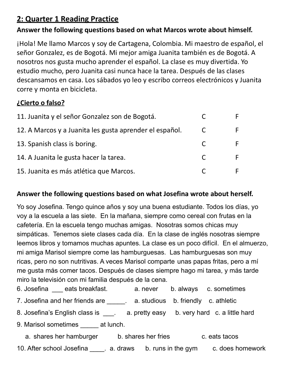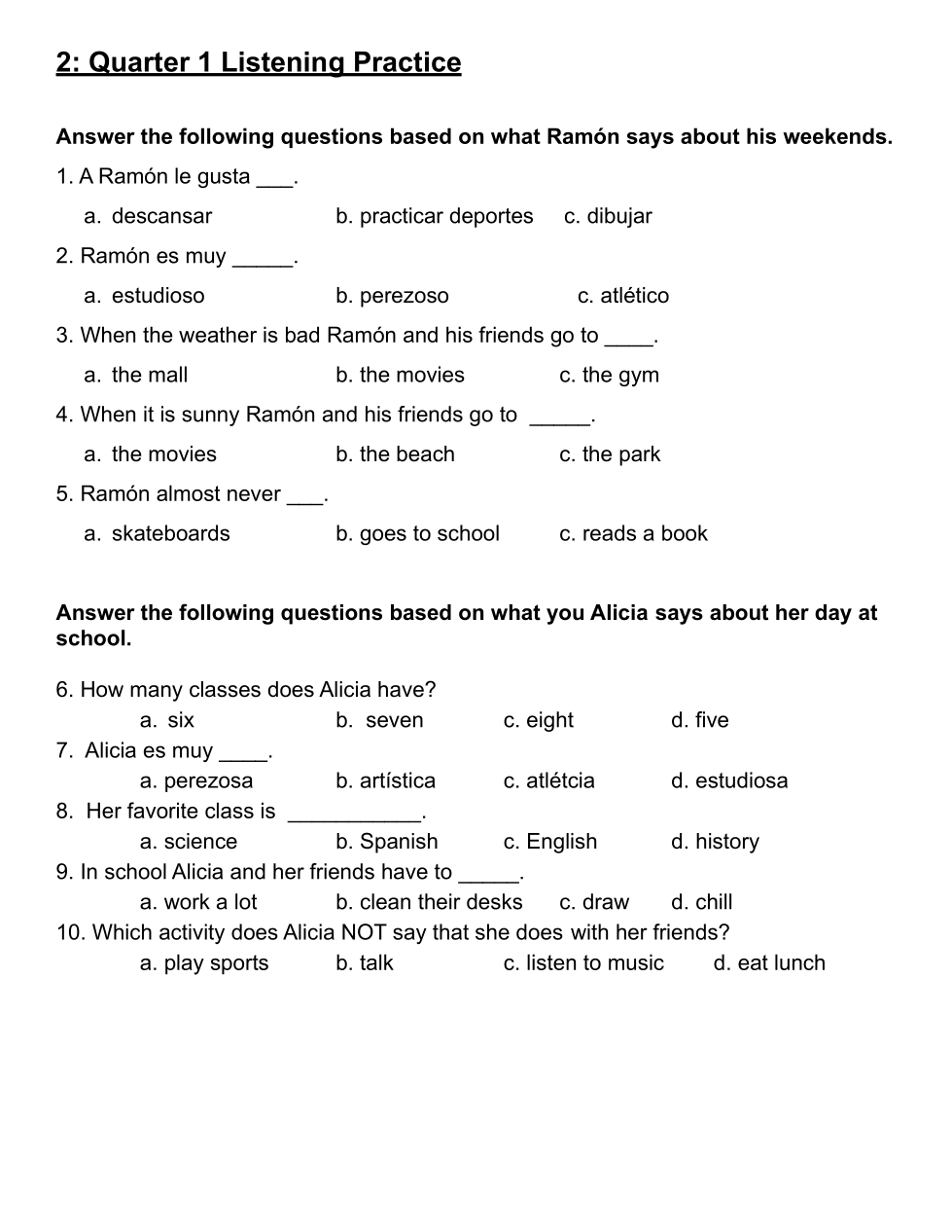 You'll hear the listening part in class, you can listen to the audio here for more practice or if you're absent. You can keep trying for a perfect score on this before you submit it on Classroom. This is one of the best study guides for your Q1 Exam!