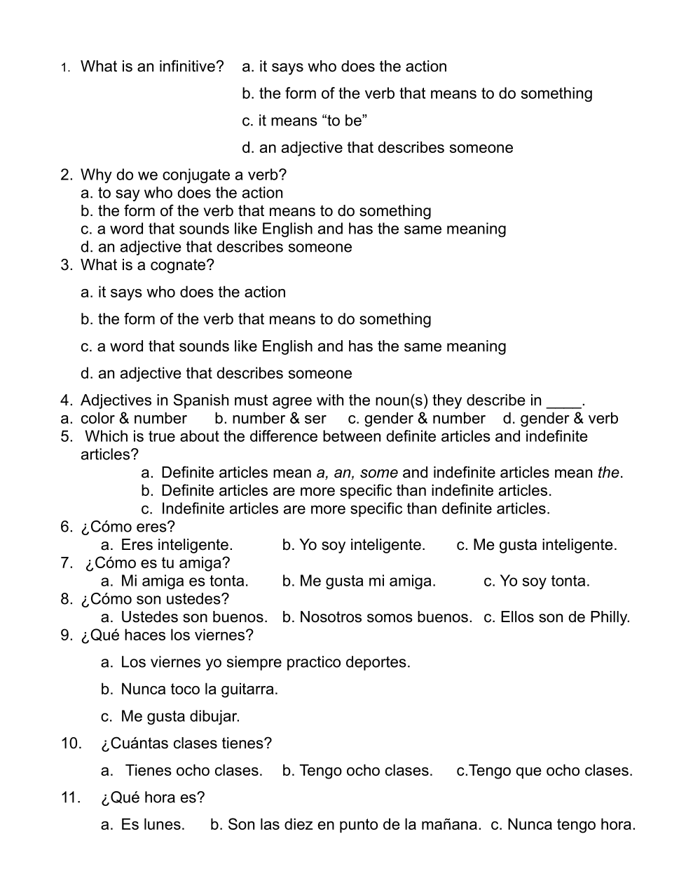 Try to do this without notes, then check the ones you got wrong and that will tell you what you need to study for the exam. You can keep trying for a perfect score before you submit this on Classroom. For the last page type with no capitals or extra spaces and the key will grade correctly.