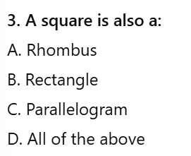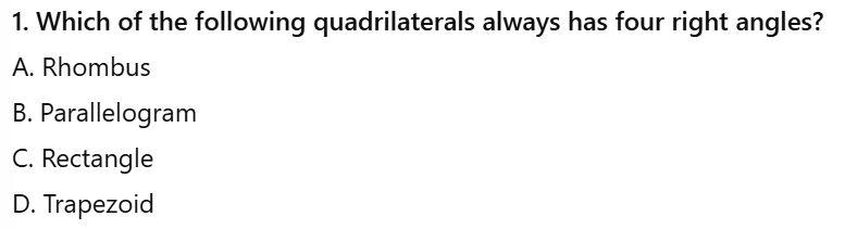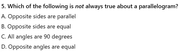 Select the five types of quadrilaterals that we discussed in class?