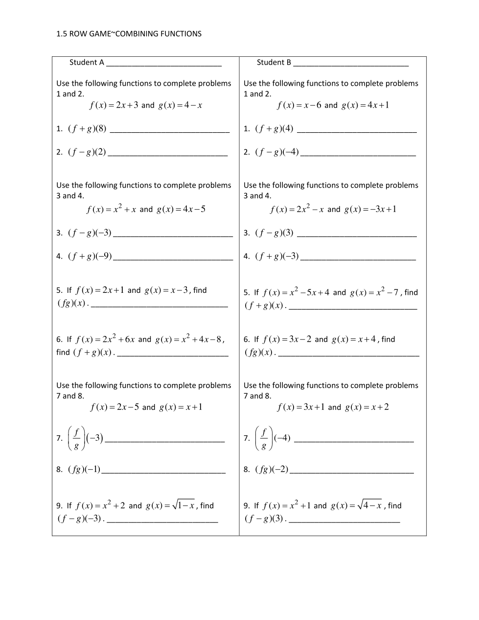 1.5 ROW GAME~ COMBINING FUNCTIONS
