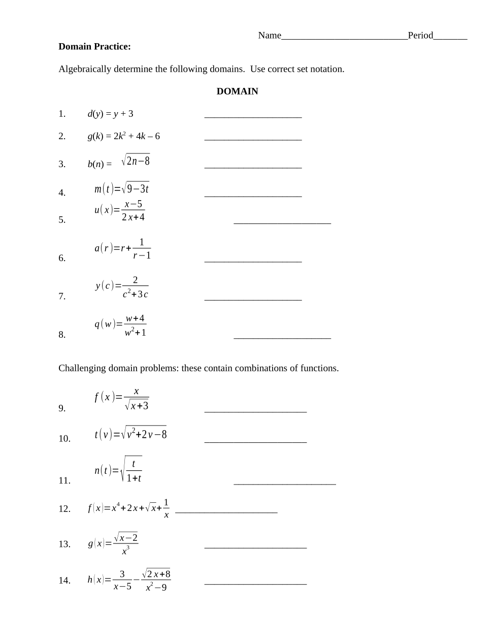 This domain practice is challenging. Think about the meaning of domain and WHY it might not be all real numbers. When you find your answer test some of the values in the domain, especially the critical values, to see why they do or do not work. To get full hwk credit you will need to get at least 8/11 correct. Be sure to use interval notation and the∪ symbol can be found in one of the accessible keyboards.