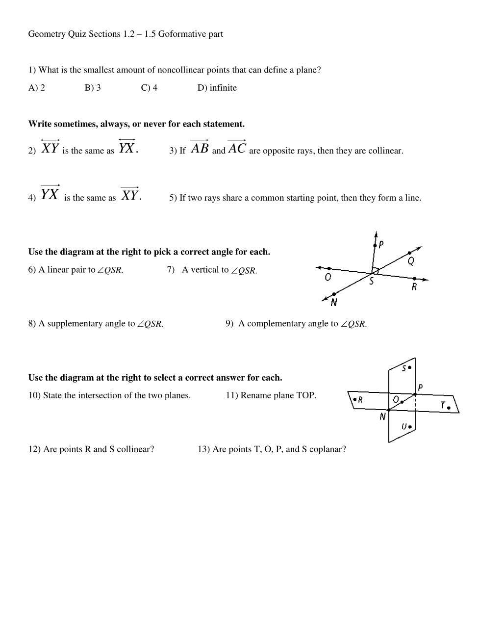 Geometry Sections 1.2 - 1.5 Quiz