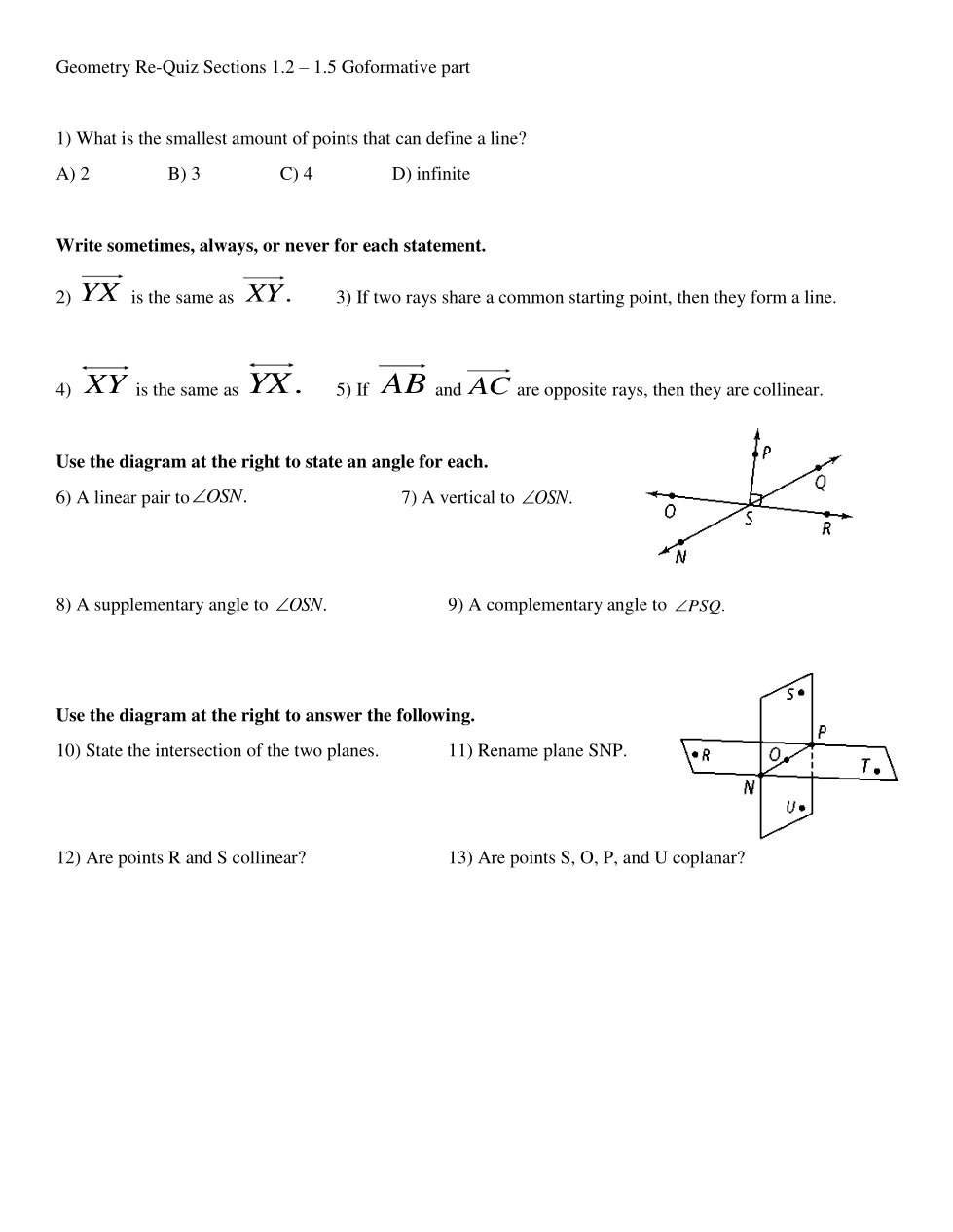 Geometry Sections 1.2 - 1.5 Re-Quiz