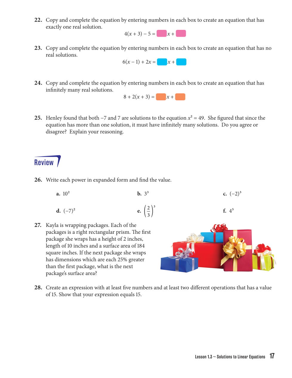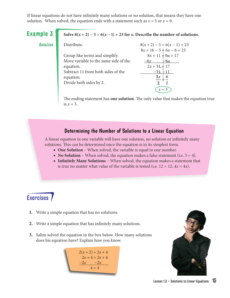 14. Write the equation with no spaces; one solution/no solutuion/infinitely many solutions. i.e. 5=6; no solution