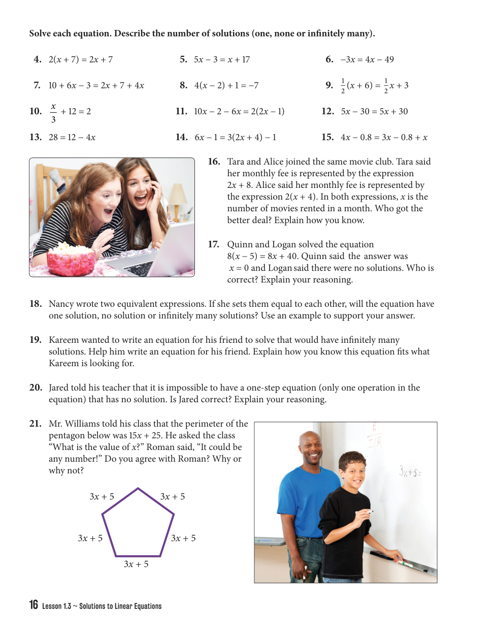 15. Write the equation with no spaces; one solution/no solutuion/infinitely many solutions. e.g. 5=6; no solution