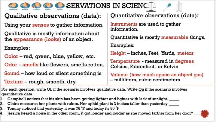 These kind of observations are made using instruments such as rulers, balances and thermometers __________.
