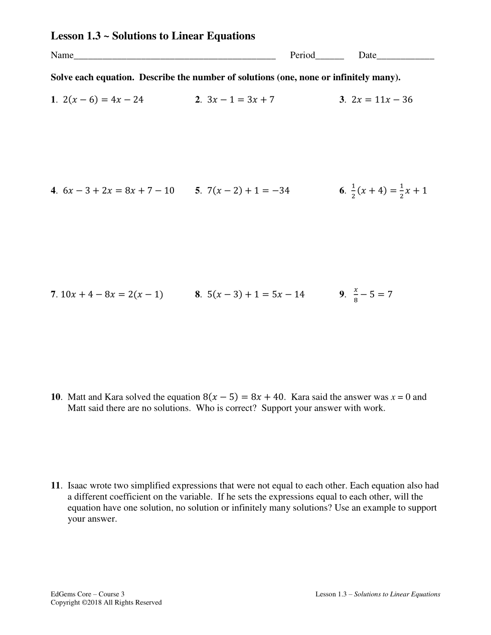 write the equation; one solution; no solution; infinitely many solutions i.e. x=2; one solution