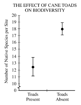 Cane toads are an invasive species that were introduced to Australian ecosystems. Researchers studying cane toads hypothesize that cane toads are negatively affecting native species. The researchers observed different locations with and without cane toads and collected the data that are presented in the