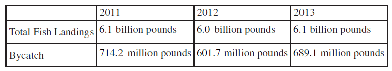 Fish landings are defined as the total catch of marine fish that are brought into ports for sale. Bycatch refers to the unwanted fish and other marine organisms that are caught during commercial fishing operations, but are not harvested or sold. Which of the following methods would you use to calculate the percent of the total catch of all fish in 2012 that was bycatch?