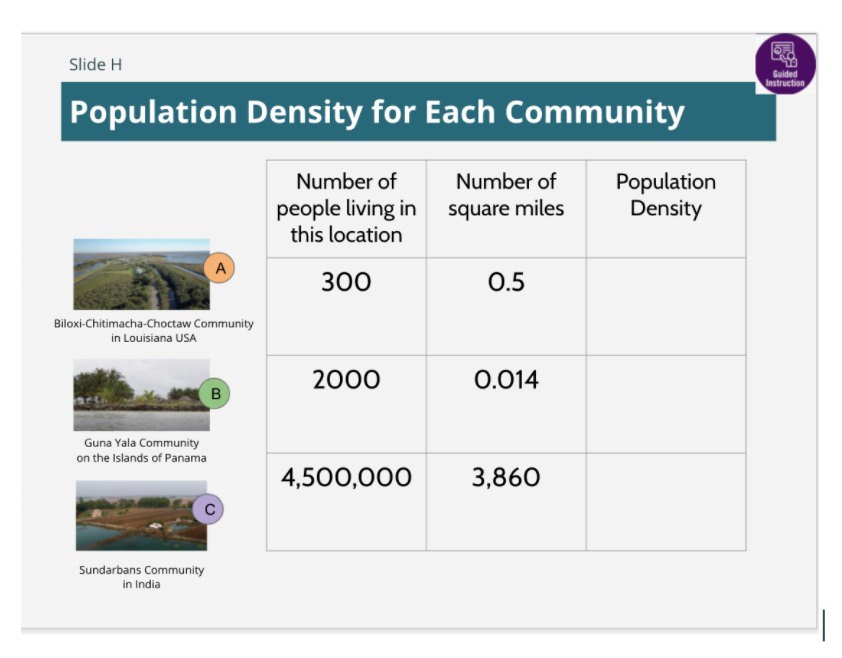 Slide H shows the population density or how many people live in a certain area for our three communities. What could you do to calculate the population density?