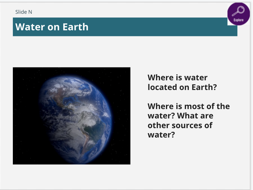 Where is water located on Earth? Where is most of the water? What are other sources not seen on this animation?