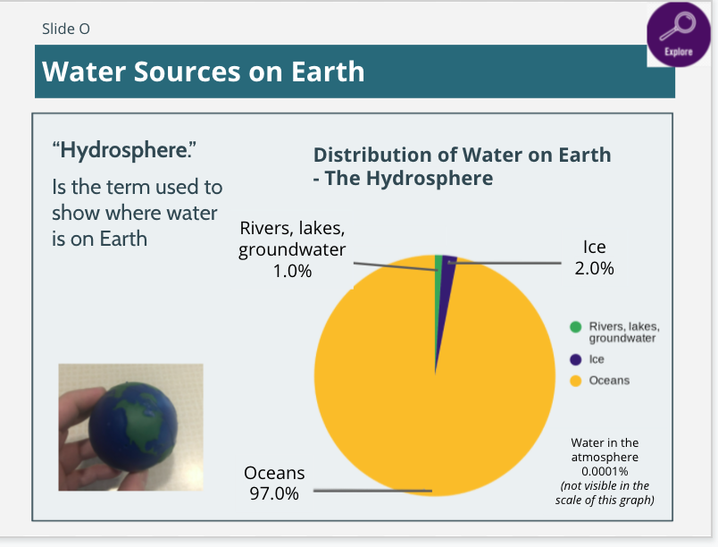 What do you notice about Earth's hydrosphere? Where is water located? Where is most of the water, least of the water? (Use specific evidence from the graph)