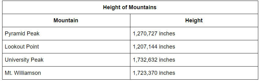 Mr. M was comparing heights of Pyramid Peak and Lookout Point. Which symbol (>, <, =) should he put in the blank?