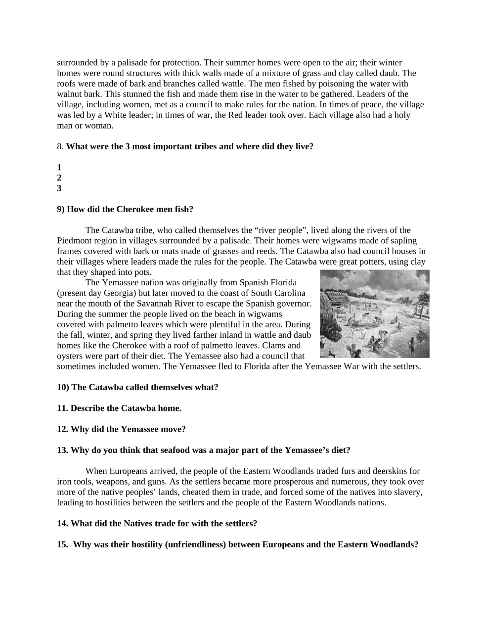 The Yemassee nation was originally from Spanish Florida (present day Georgia) but later moved to the coast of South Carolina near the mouth of the Savannah River to escape the Spanish governor. During the summer the people lived on the beach in wigwams covered with palmetto leaves which were plentiful in the area. During the fall, winter, and spring they lived farther inland in wattle and daub homes like the Cherokee with a roof of palmetto leaves. Clams and oysters were part of their diet. The Yemassee also had a council that sometimes included women. The Yemassee fled to Florida after the Yemassee War with the settlers.