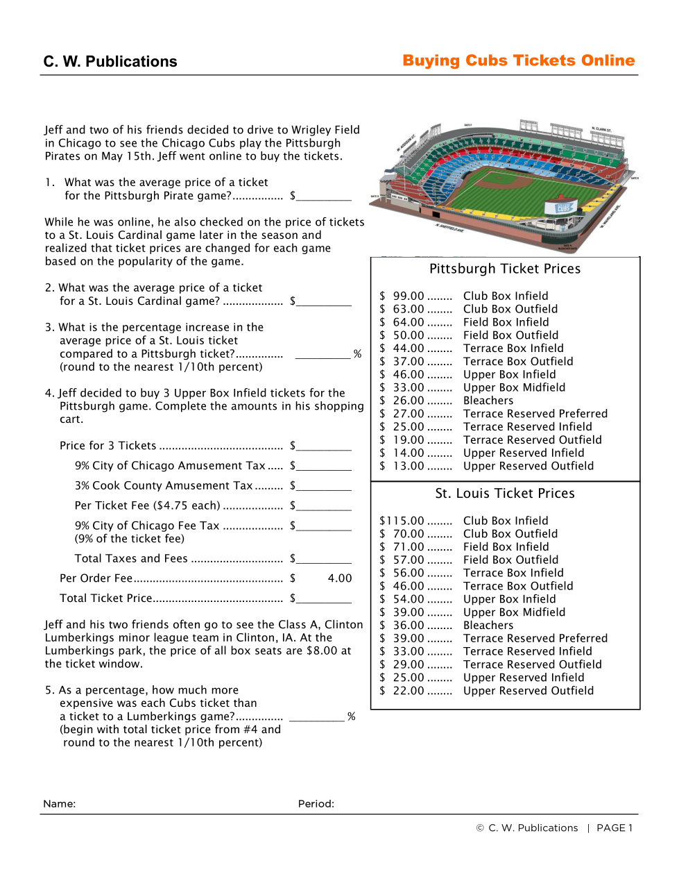 For #11, find the percent increase from the total ticket price for all three Cubs tickets (answer to #10) to the gate price for three tickets to see the Lumberkings.