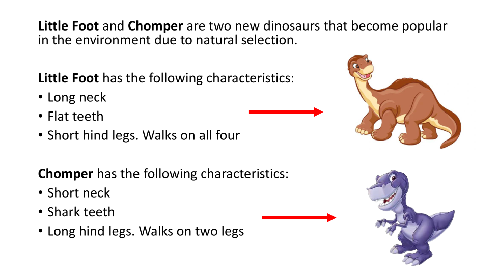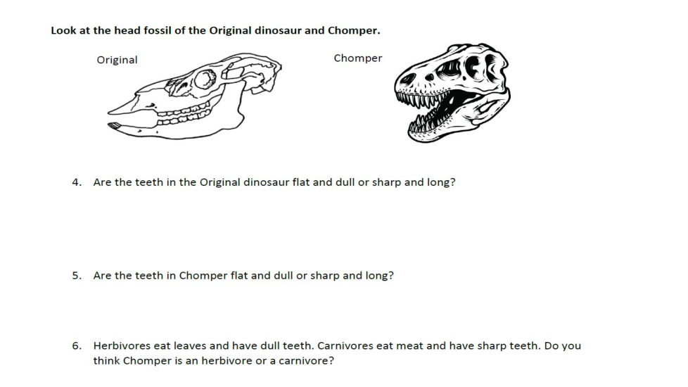 The original dinosaur has a short neck, flat teeth, and short hind legs. How is chomper different from the original dinosaur?