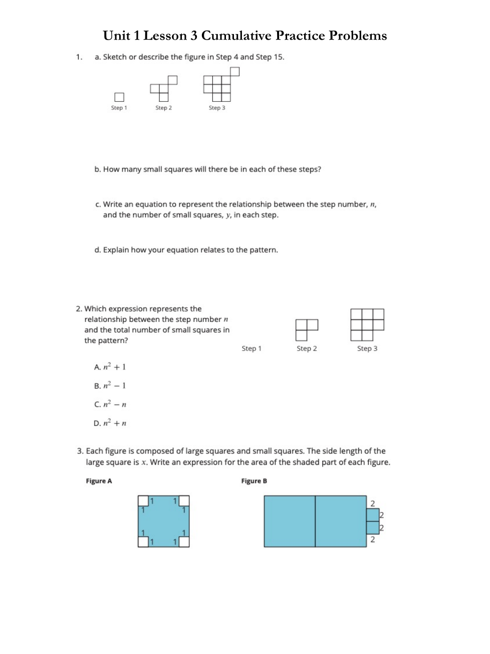 Write an equation to represent the relationship between the step number, n, and the number of small squares, y, in each step.