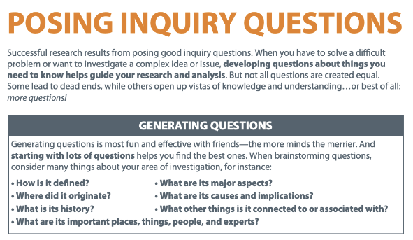 Directions: Before you begin research, you will want to generate inquiry questions to address in your presentation. The purpose of this activity is to narrow down your research and keep you focused. It is not intended to be comprehensive, but it is a starting point.