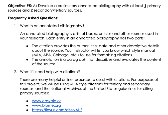 - 5B: Submit revised annotated bibliography with at least 2 primary sources and 3 secondary/tertiary sources.