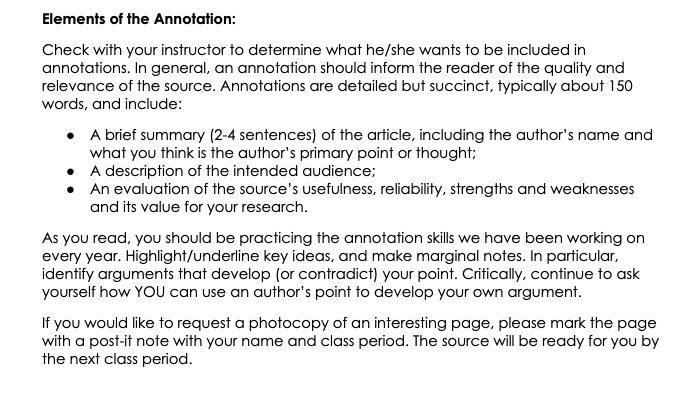 Directions: For this next objective, you have two different deadlines. Annotated bibliographies should be turned in via hard copy.