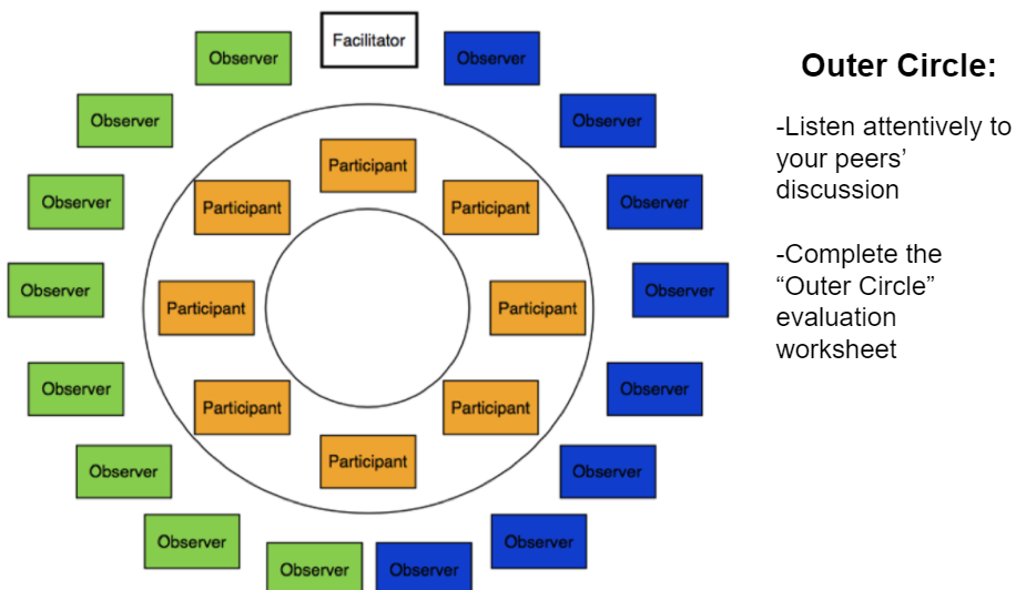 We will divide our class into two circles --- a smaller, inner circle and a larger, outer circle. The inner circle will be provided with an opportunity to talk while the outer circle listens.