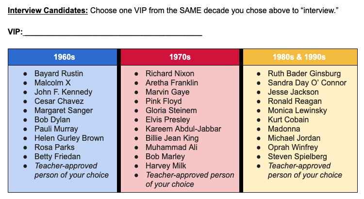 Exit Ticket: Who is the VIP from the SAME decade that you chose for #5 that you are going to interview?