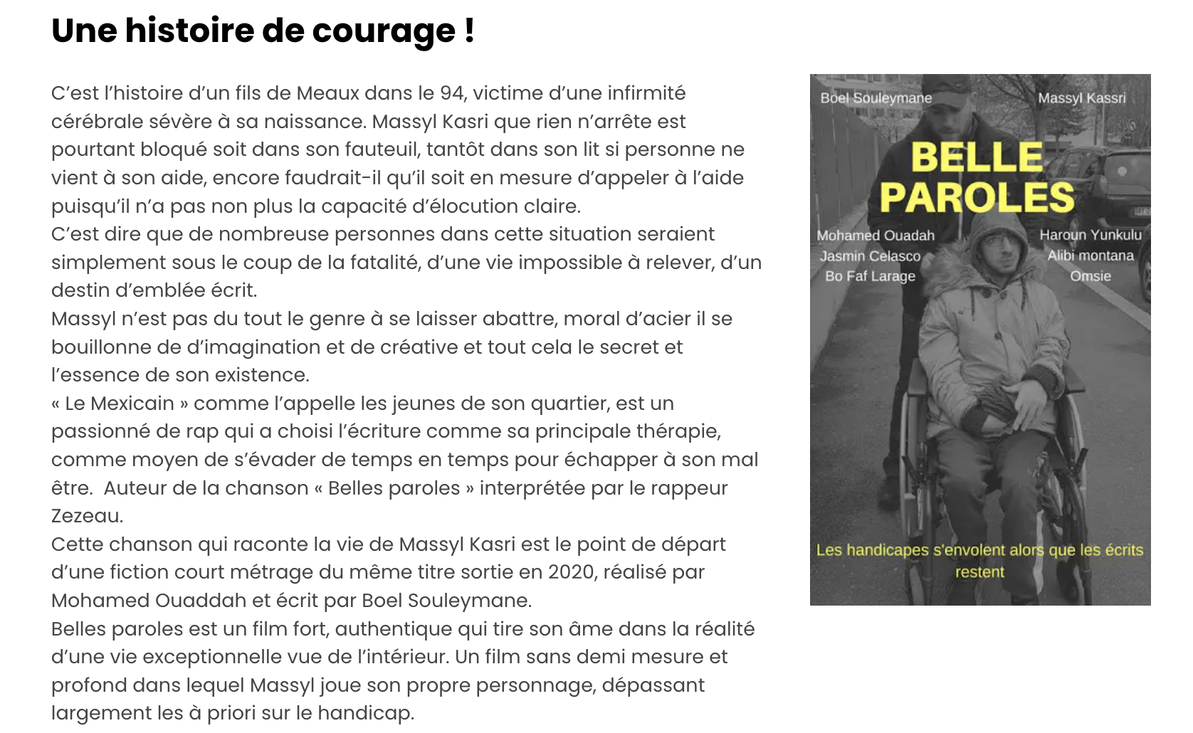 « J'ai découvert un jeune homme passionné par le rap et qui écrit des textes poignants. Il a vraiment du talent », assure l'agent de la voirie (autoroute). Lui vient alors l'idée de faire un film de cette histoire. Dans le même temps, Massyl Kasri, 26 ans aujourd'hui, rencontre le rappeur, Zezeau pour réaliser son rêve : faire un album...Une vraie victoire pour ce jeune homme qui mène « un combat de tous les jours ». - Mohammed Ouaddah, réalisateur du film, le Parisien