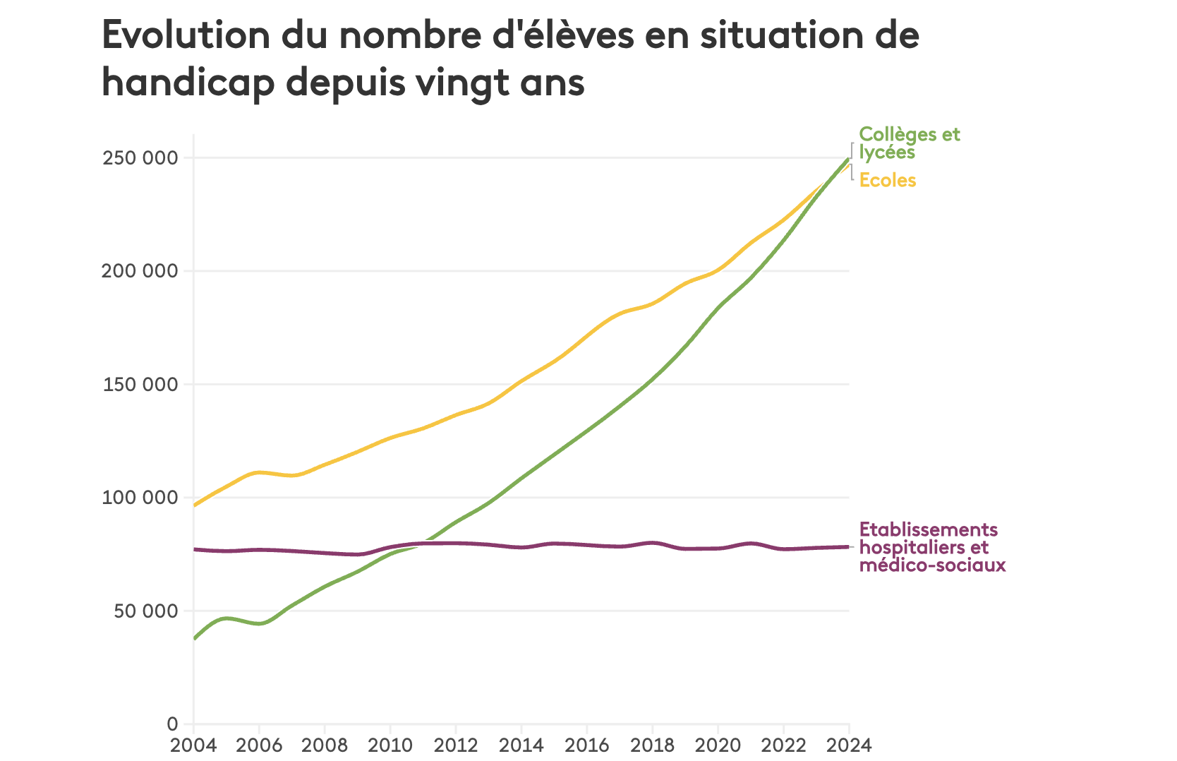 Un nombre record d’enfants en situation de handicap va faire leur rentrée scolaire en France en 2024 : 520 600 élèves. C’est plus de trois fois plus qu’il y a vingt ans (152 000). Cette évolution vient surtout de la loi de 2005, qui a affirmé que tous les enfants ont le droit d’aller à l’école de leur quartier. La loi a aussi élargi la définition du handicap : elle inclut maintenant les troubles d’apprentissage comme la dyslexie, ou encore certains troubles psychologiques ou du développement.
