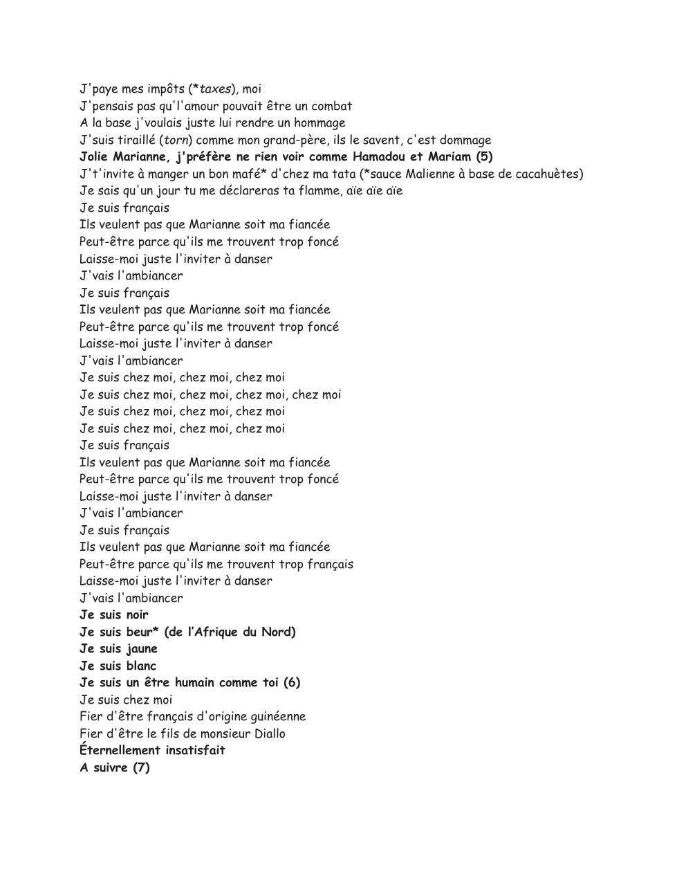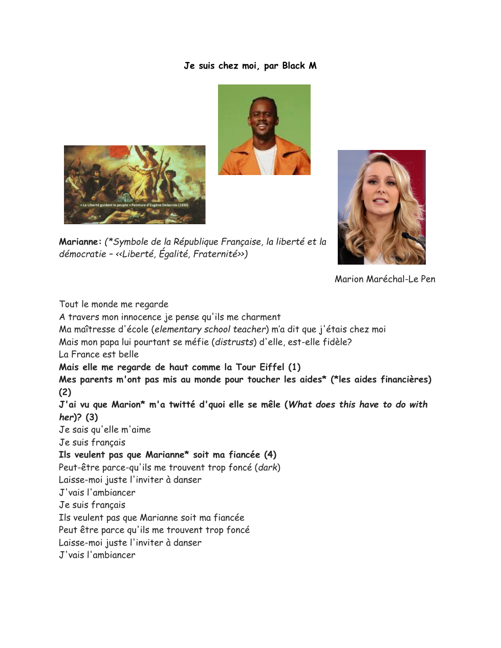 Devoirs: Une chanson autobiographique: Black M a écrit <<Je Suis Chez Moi>> comme chanson autobiographique. Y a-t-il une chanson avec laquelle tu t'identifies et donc est assez autobiographique pour toi? Laquelle? Pourquoi? Sinon, parle d'une chanson qui est autobiographique pour la chanteuse ou le chanteur.