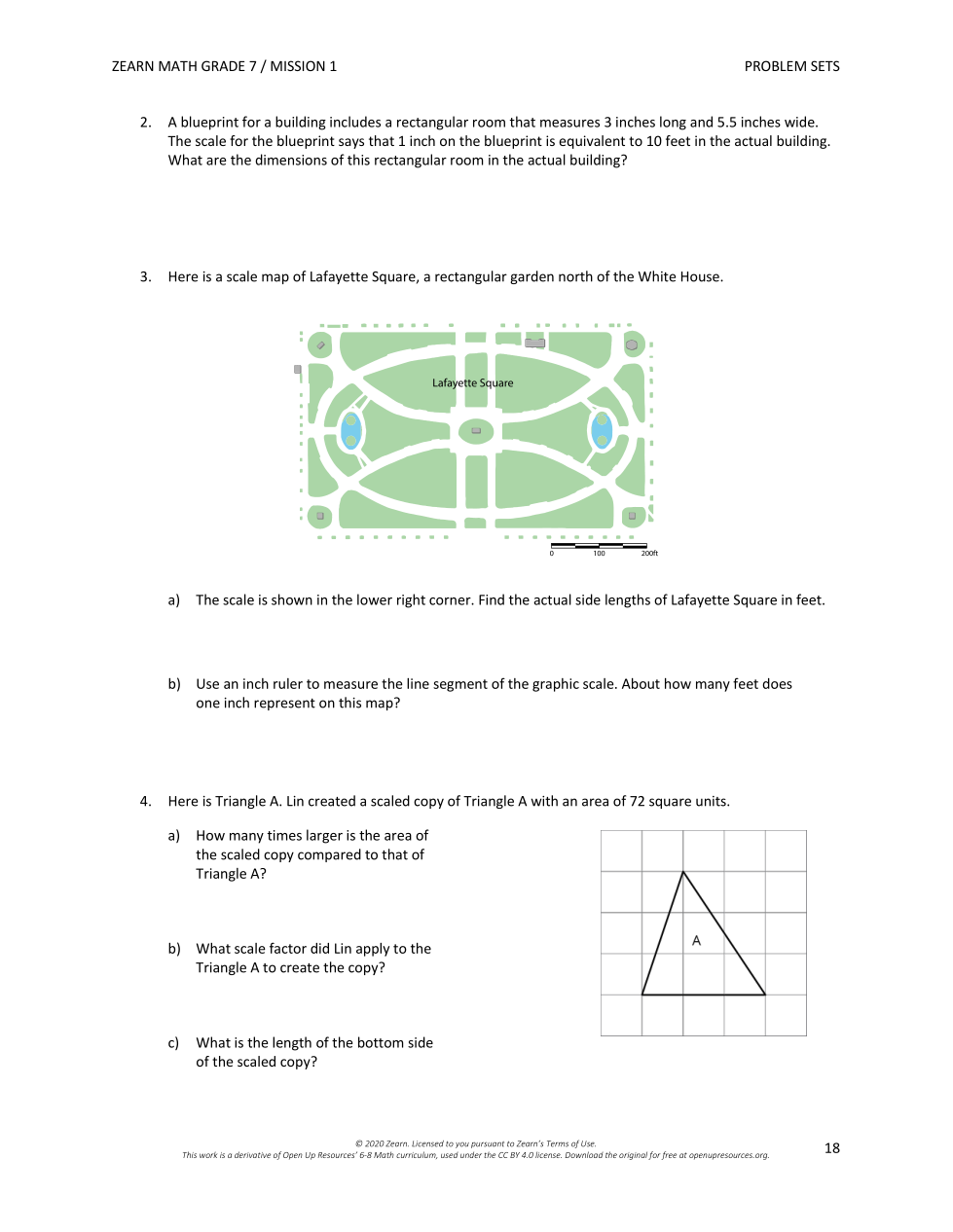 a) The scale is showin the lower right corner. Find the actual side lengths of Lafayette Square in feet.