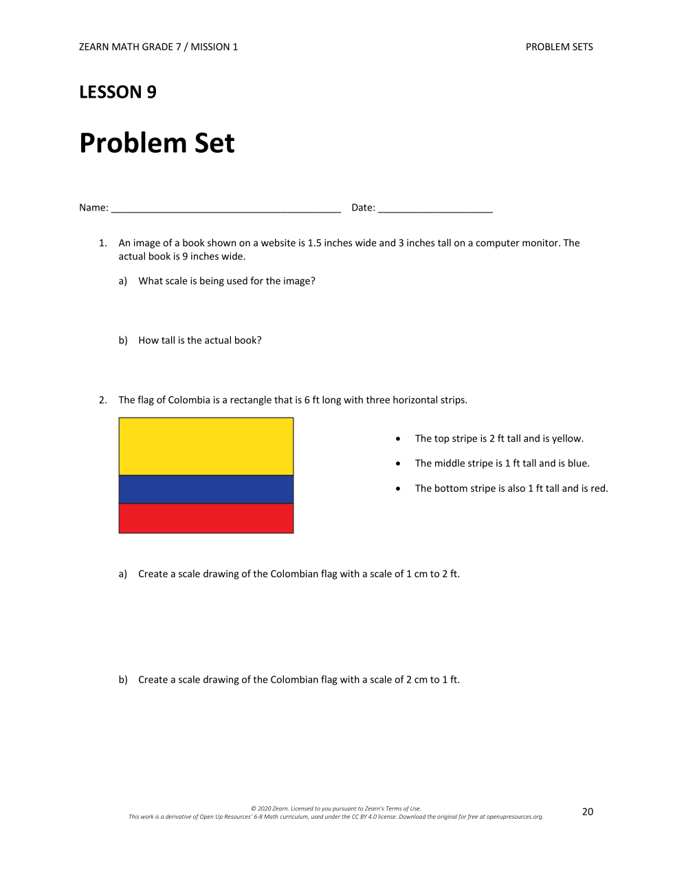 2a) Create a scale drawing of the Columbian flag with a scale of 1 cm to 2 ft.