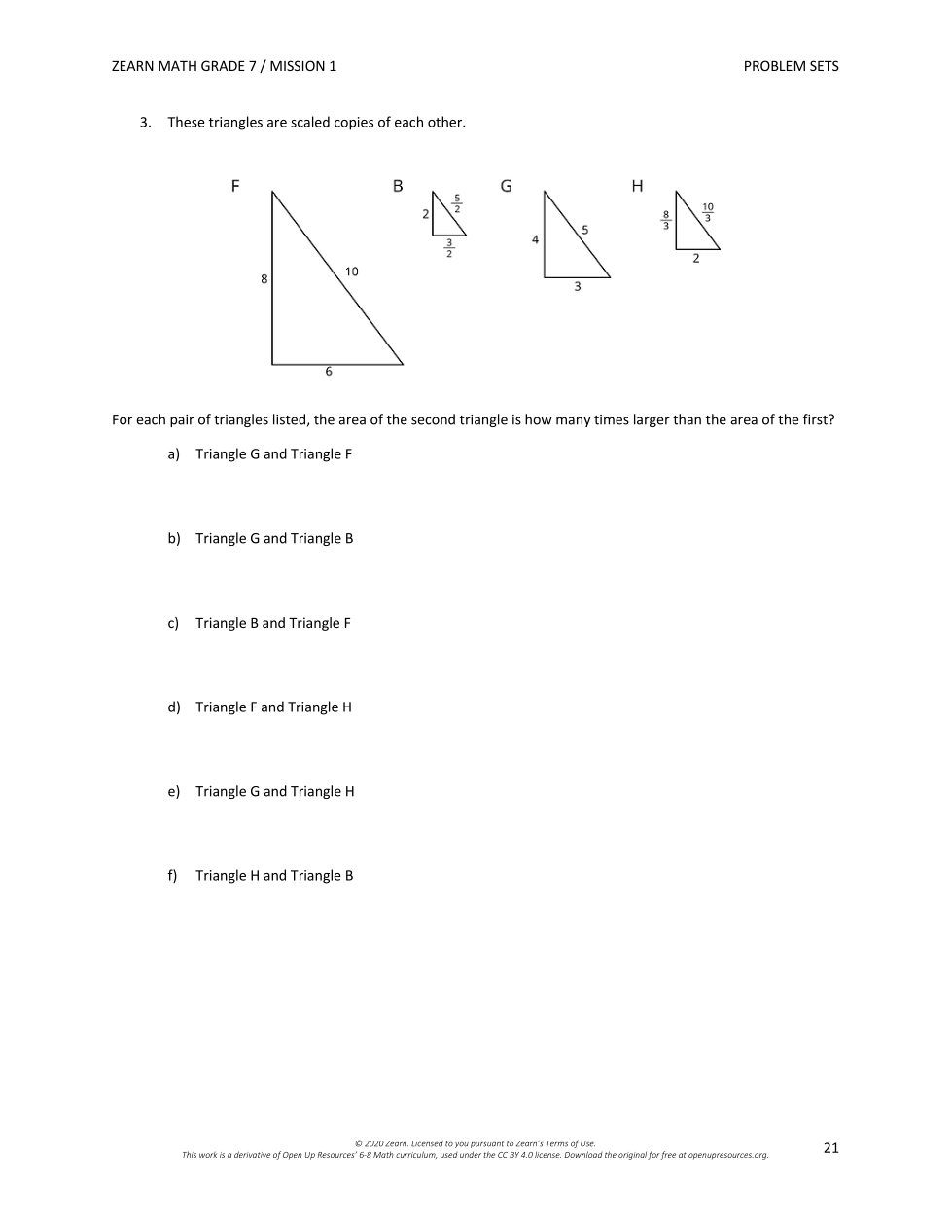 3. These triangles are scaled copies of each other. For each pair of triangles listed, the area of the second triangle is how many times larger than the area of the first?