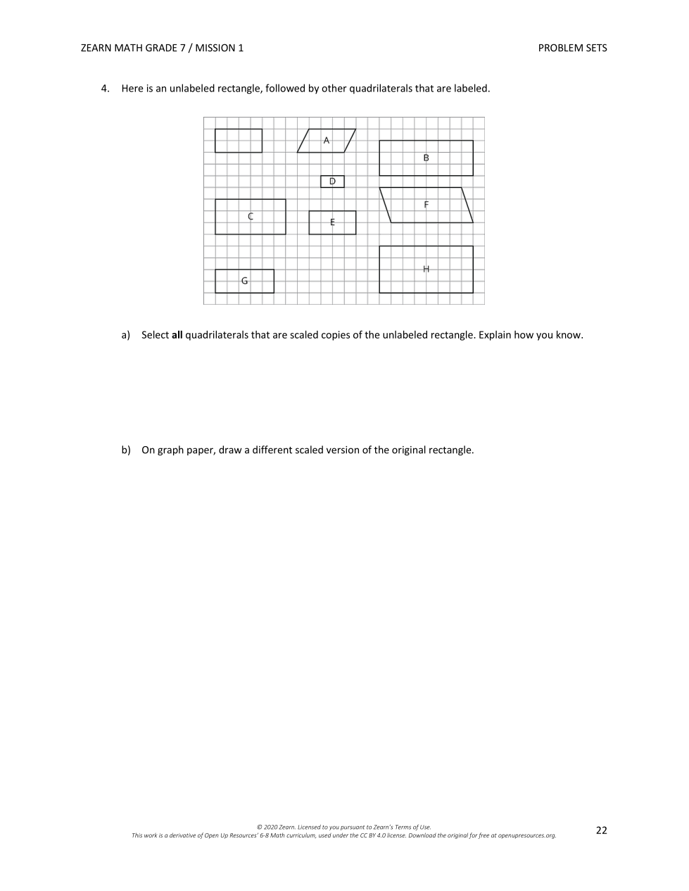 4. Here is an unlabeled rectangle, followed by other quadrilaterals that are labeled. a) Select ALL quadrilaterals that are scaled copies of the unlabeled rectangle. Explain how you know in the space provided below.