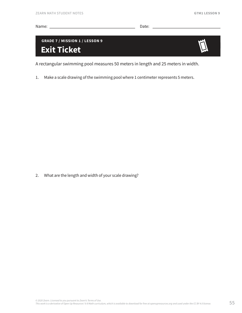 1. Make a scale drawing of the swimming pool where 1 cm represents 5 meters.