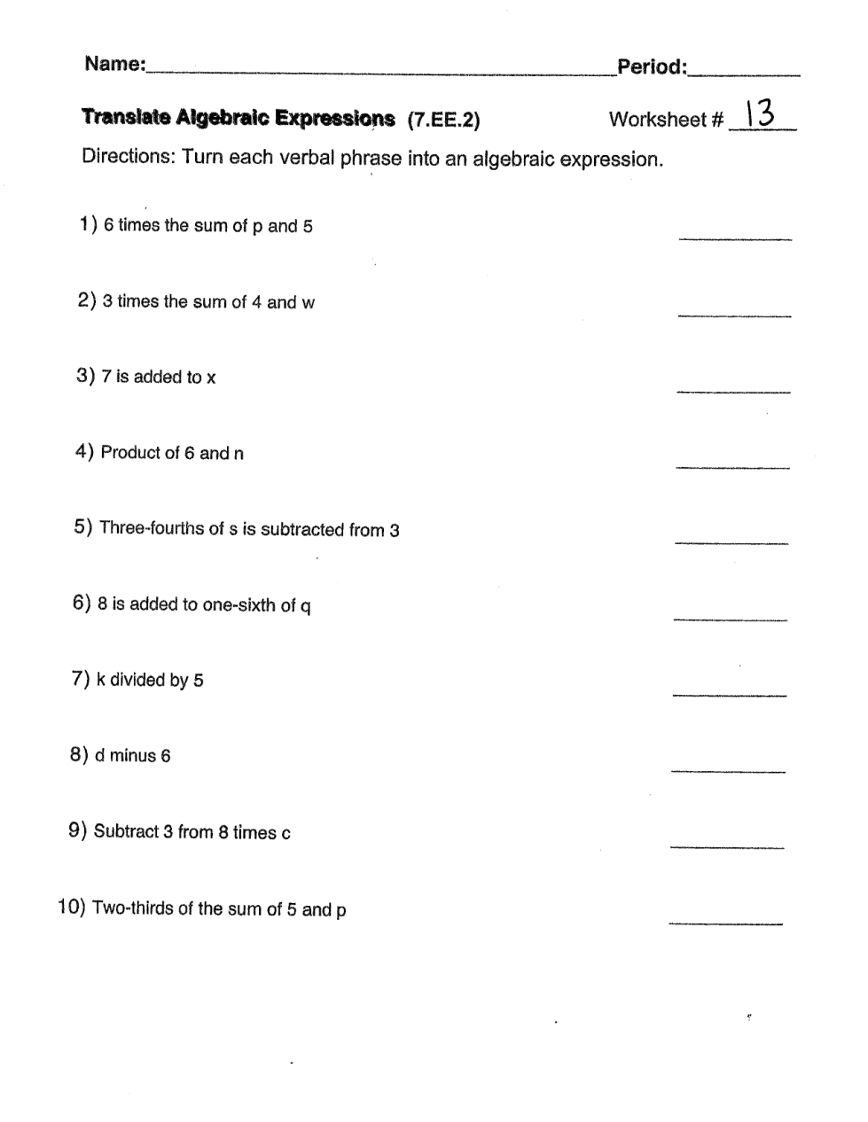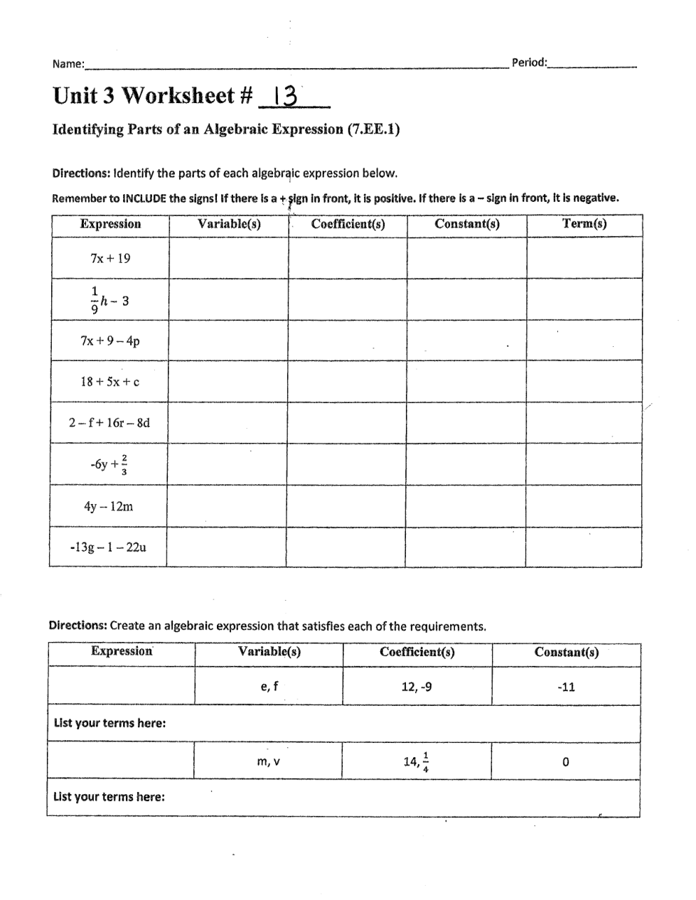 7LRIS Honors WS #13 - Translating Expressions & Identifying Parts