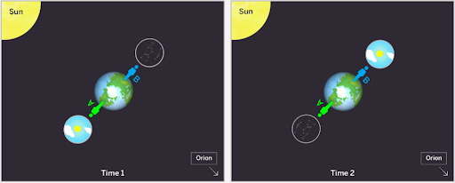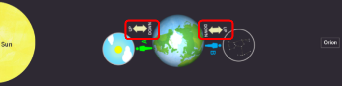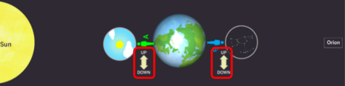 As person A rotated to from seeing the sun to seeing Orion, did UP and DOWN stay the same or change?