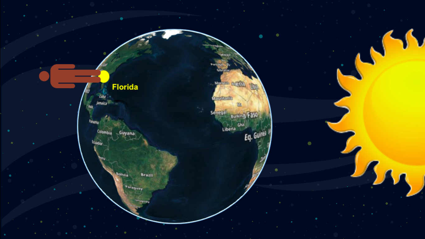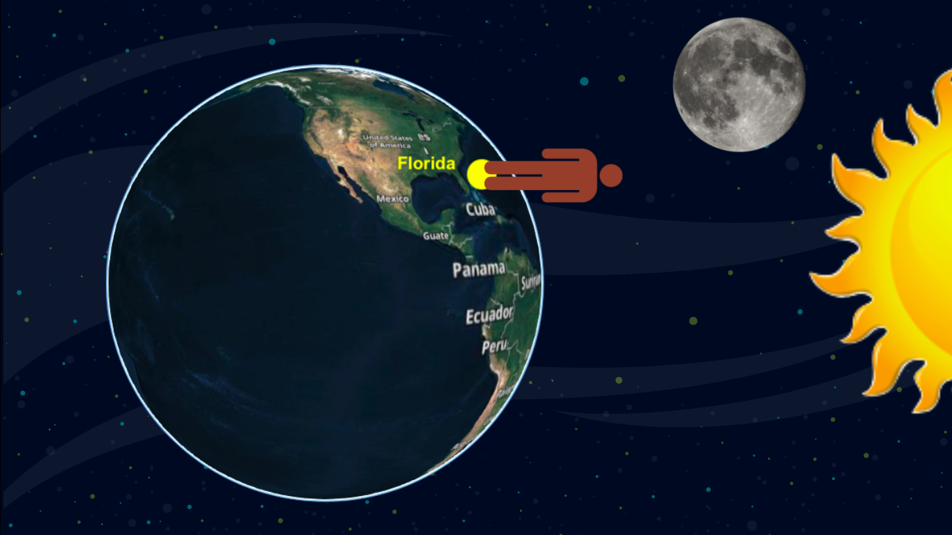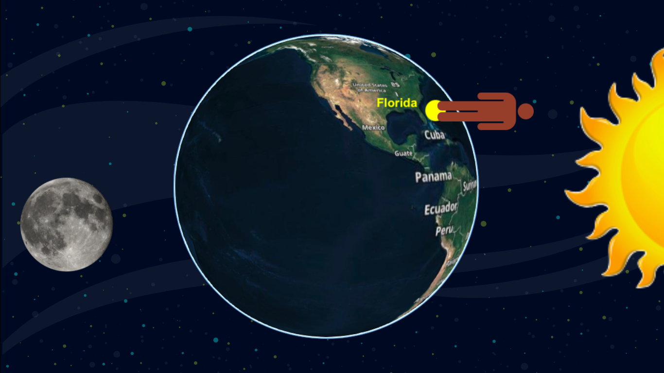 Is it daytime in Florida. IS THE MOON IS ON THE SAME OR OPPOSITE SIDE AS THE SUN?