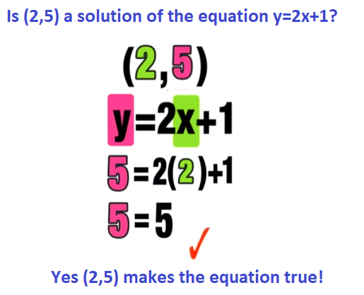 Recall that a solution to an equation is a (x,y) point that lies on the line of the equation and therefore makes the equation true.