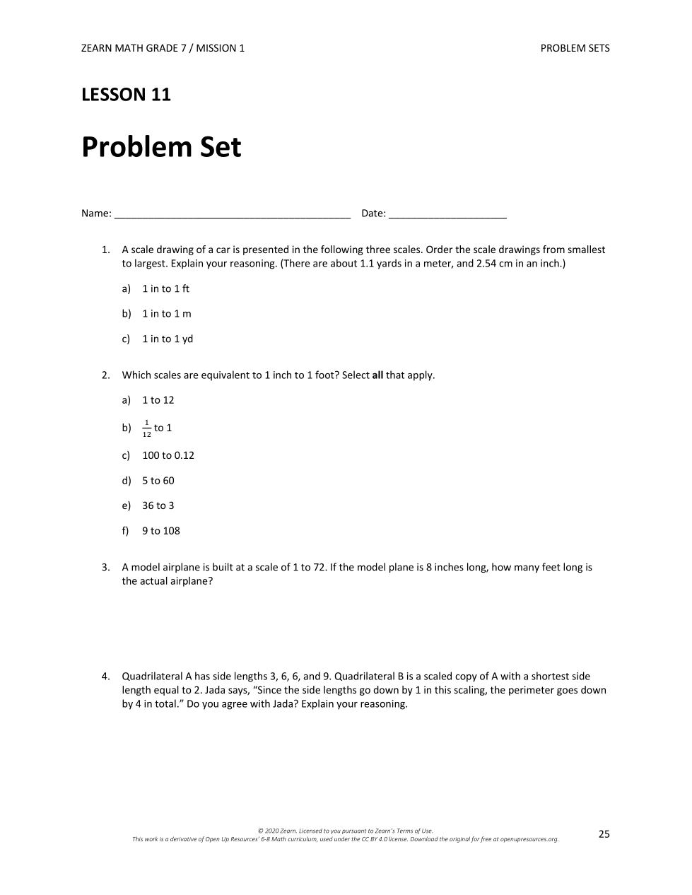 1. A scale drawing of a car is presented in the following 3 scales. Order the scale drawings from smallest to largest. *There are about 1.1 yards in a meter and 2.54 cm in an inch.