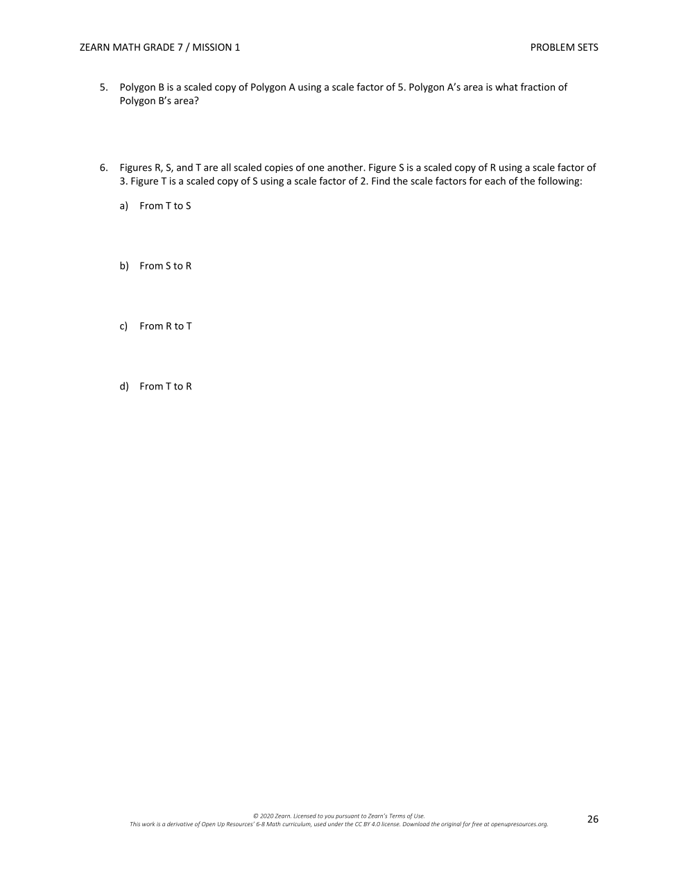 6. Figures R, S, and T are all scaled copies of one another. Figure S is a scaled copy of R using a scale factor of 3. Figure T is a scaled copy of S using a scale factor of 2. Find the scale factors for each of the following: