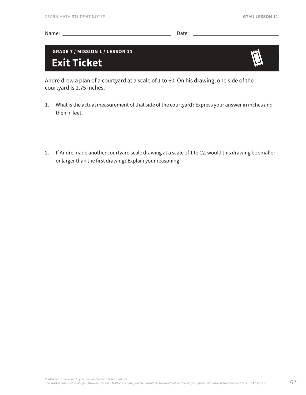Exit TicketAndre drew a plan of a courtyard at a scale of 1 to 60. On his drawing, one side of the courtyard is 2.75 inches.