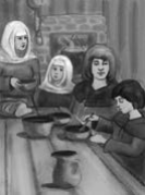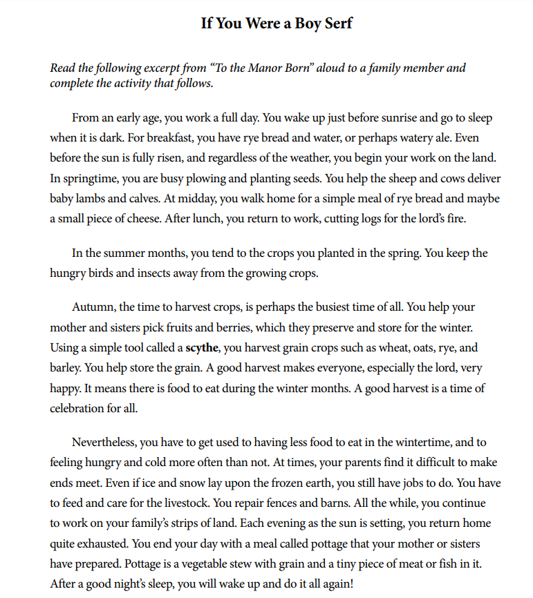 Write one sentence for each of the four images to describe what the serf might be doing in each image. Refer to the text, “If You Were a Boy Serf,” to find evidence to support your response. Incorporate vocabulary words from the text when possible and use complete sentences.