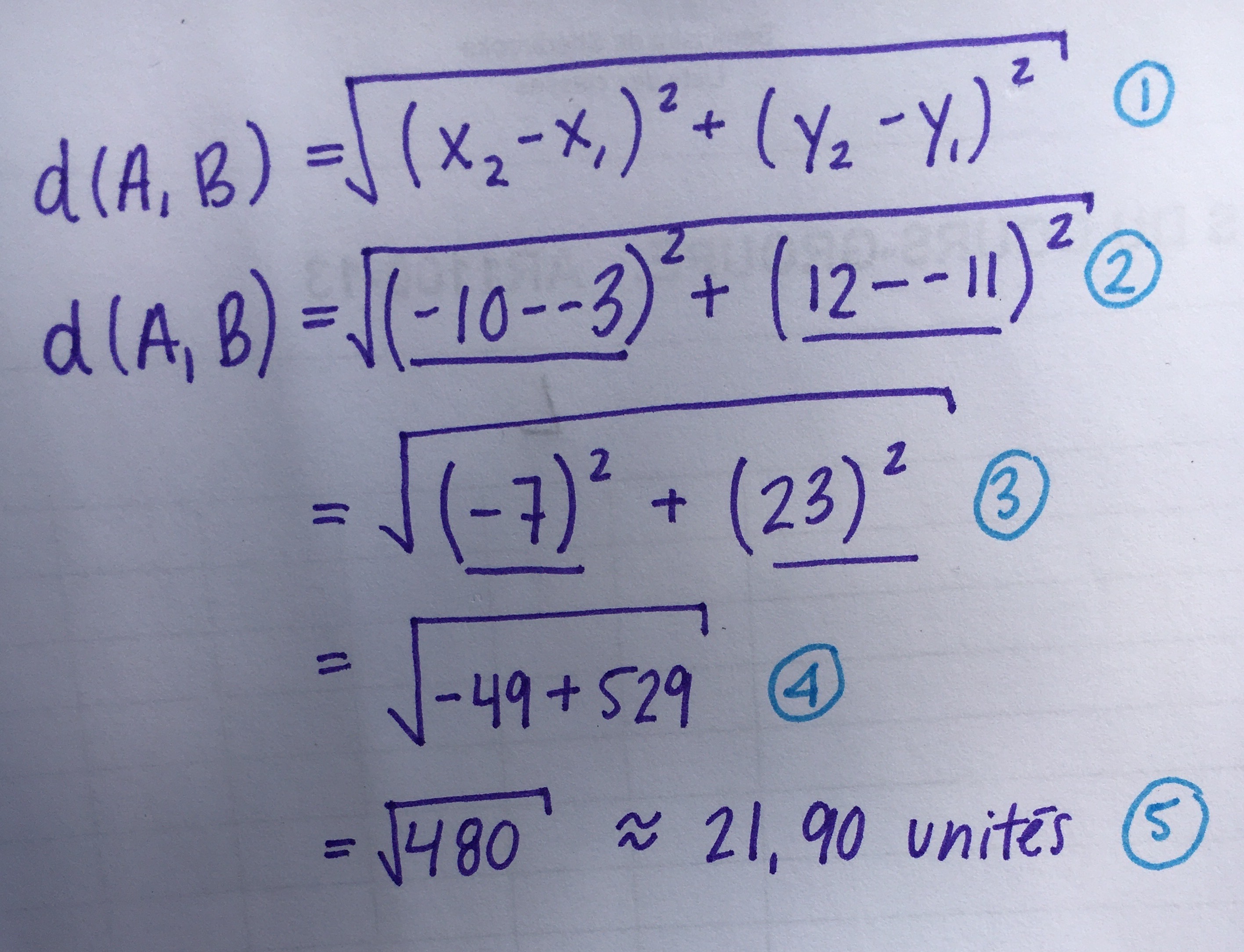 Soit les points A(-3,-11) et B(-10,12). On veut trouver la distance entre les 2 points. Voici la démarche faite pour répondre à la question.